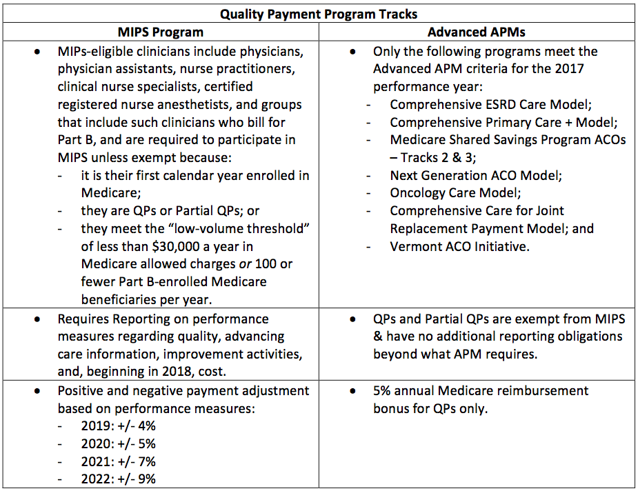 MACRA’s Quality Payment Program has two distinct tracks for value-based Medicare Part B reimbursement: the Merit-Based Incentive Payment System (MIPS) and Advanced Alternative Payment Models (APMs).